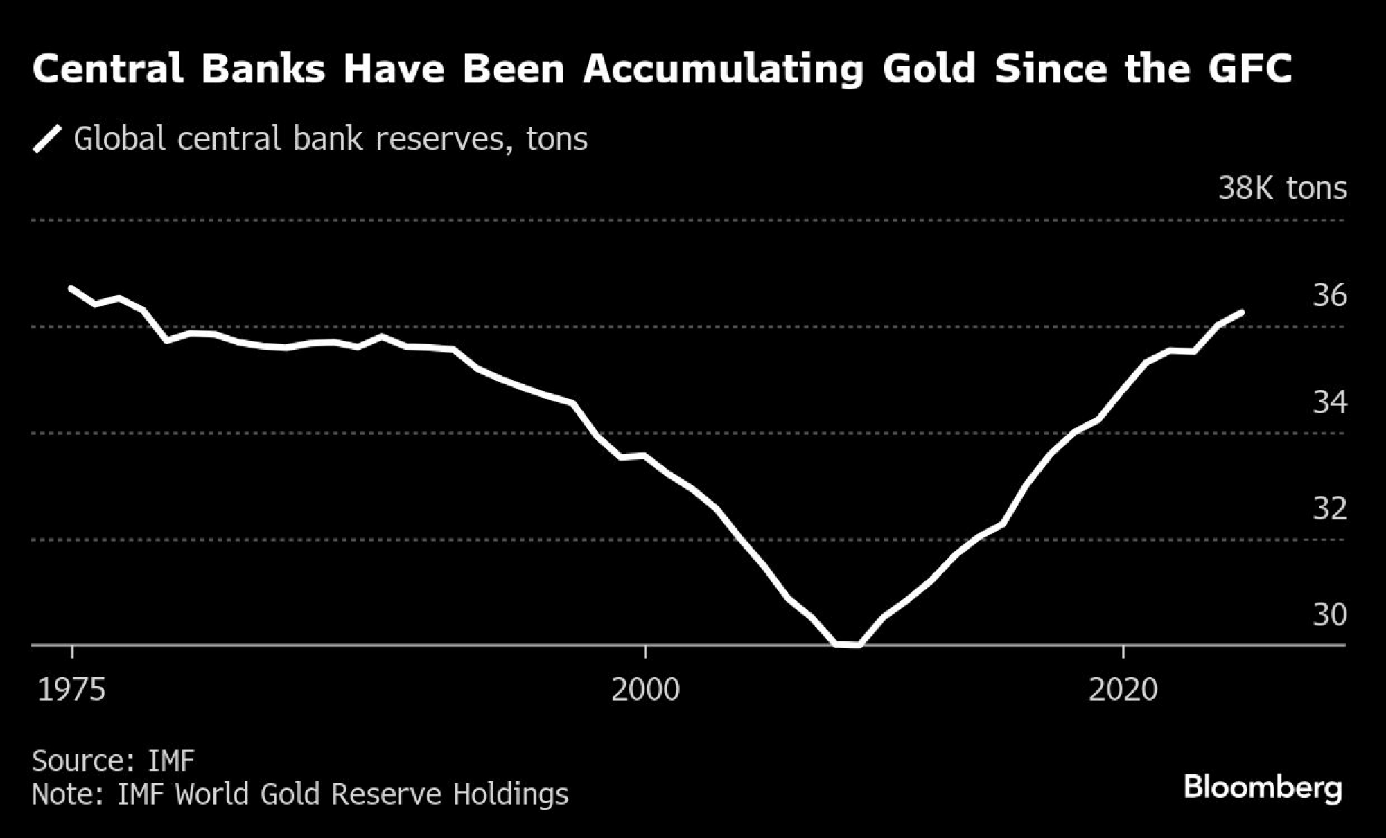 Centralne banke su bile ključni pokretač uspona zlata, prelazeći sa neto prodavaca na neto kupce nakon globalne finansijske krize. Tempo kupovine se udvostručio nakon što su SAD i njihovi saveznici zamrzli devizne rezerve Rusije 2022. godine, nakon potpune invazije na Ukrajinu. To je mnoge centralne banke podstaklo da razmotre diverzifikaciju, dok inflacija i spekulacije da bi američka vlada mogla manje povoljno tretirati strane poverioce još više naglašavaju privlačnost zlata za kreatore politike.