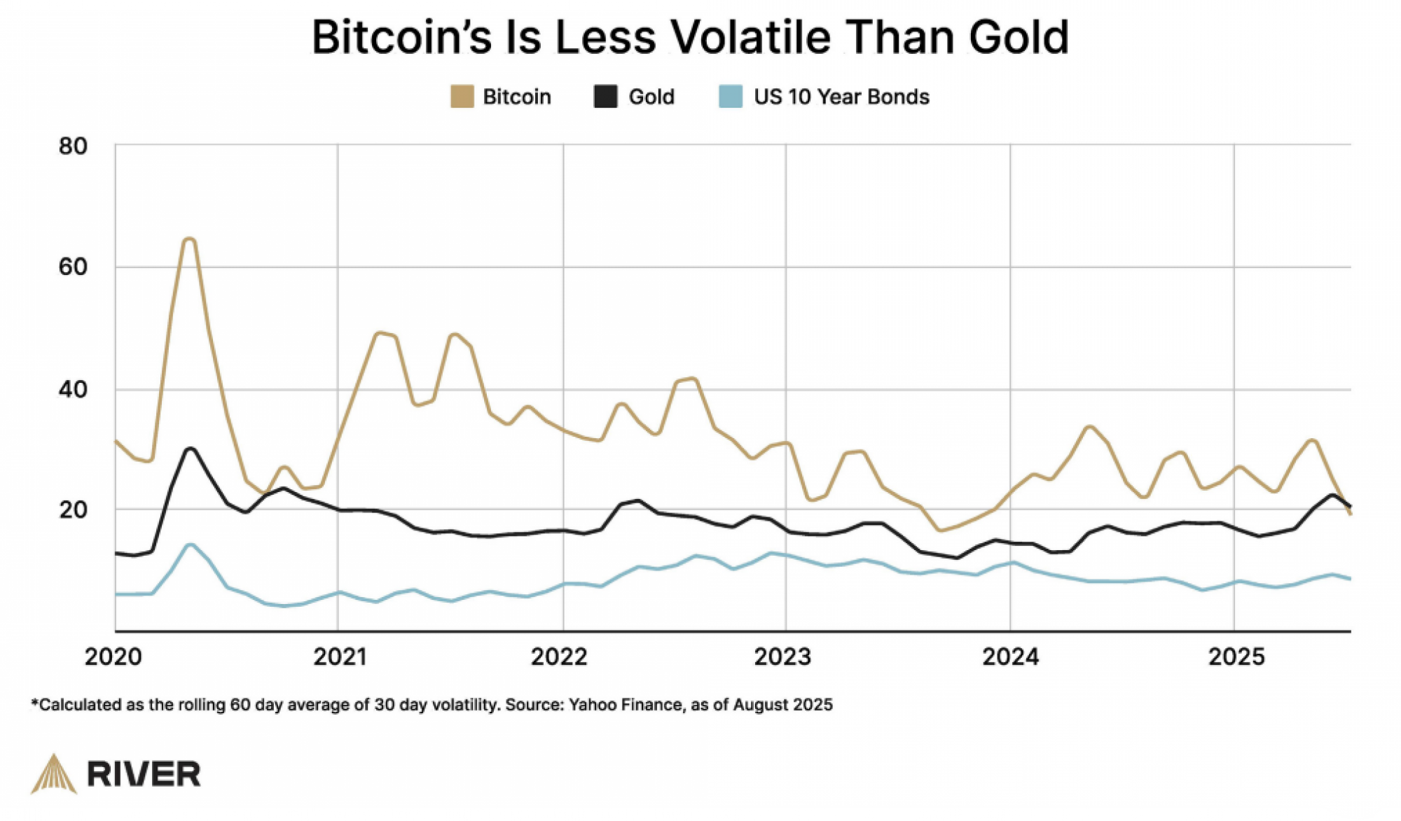 Bitcoin je manje volatilan od zlata (izračunato kao 60-dnevni pokretni prosek volatilnosti tokom 30-dnevnog perioda); Izvor Yahoo Finance, od kolovoza 2025. | River