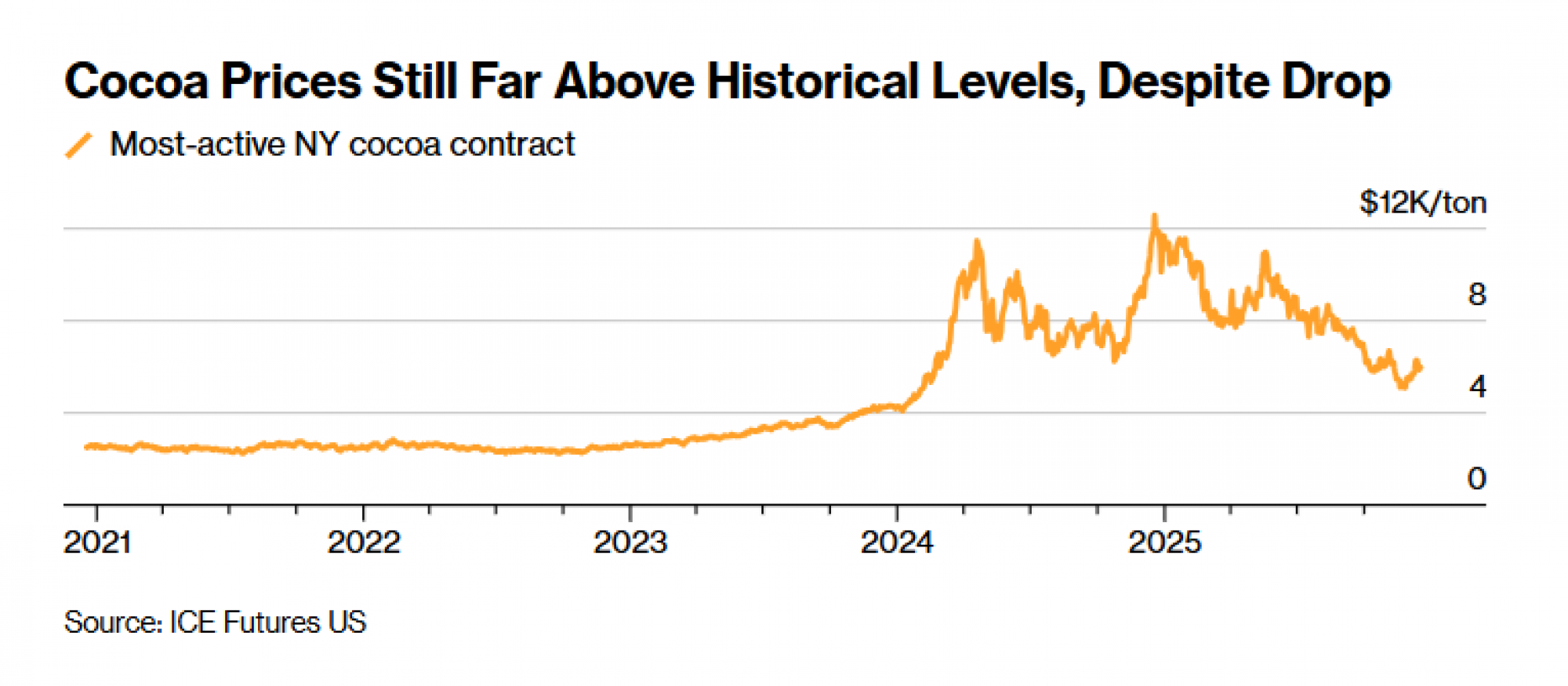Kakao je prošle godine skočio na rekordnih gotovo 13.000 dolara po toni, jer su bolesti i ekstremni vremenski uslovi opustošili useve u Obali Slonovače i Gani, koje obezbeđuju više od polovine svetske proizvodnje kakaa. Međutim, cene su potom pale kako su se poboljšali izgledi za žetvu, potražnja oslabila i kako su se smanjile neke zabrinutosti oko trajne nestašice. Ove godine su niže za oko 50 odsto, što ih vodi ka najstrmijem godišnjem padu otkako se vodi evidencija, od 1960. godine.