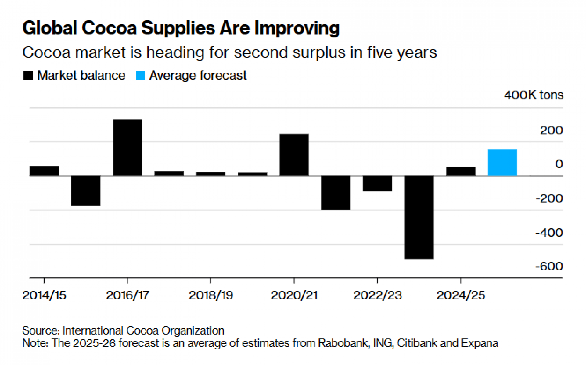 Iako su fjučersi na kakao u novembru pali ispod 5.000 dolara po toni, sada se u Njujorku kreću oko 6.000 dolara, dok trgovci razmatraju smanjena očekivanja za veliki suficit ove sezone. Analitičari iz Rabobank i Citigroup Inc. su poslednjih nedelja snizili svoje procene.
