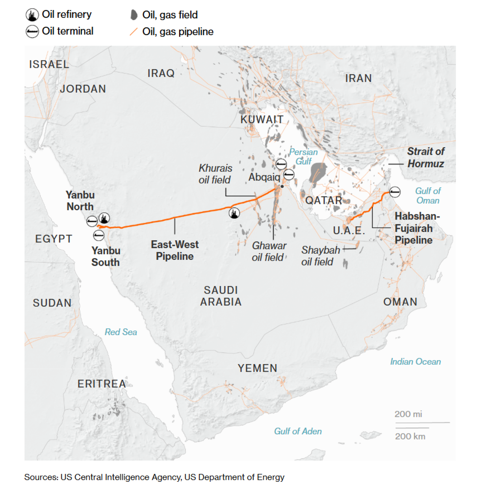 Oko 16,5 miliona barela nafte dnevno prolazi kroz moreuz, uključujući većinu iranskog izvoza. Saudijska Arabija najviše izvozi ovom rutom - oko pet miliona barela dnevno - ali pošiljke mogu biti preusmerene putem naftovoda dugog 1.200 kilometara koji prolazi kroz kraljevstvo od istoka ka zapadu, do luke na Crvenom moru, gde se nafta utovara na brodove za dalji transport. Ujedinjeni Arapski Emirati takođe mogu da zaobiđu ovo usko grlo slanjem oko 1,5 miliona barela dnevno kroz naftovod koji završava u Omanskom zalivu.