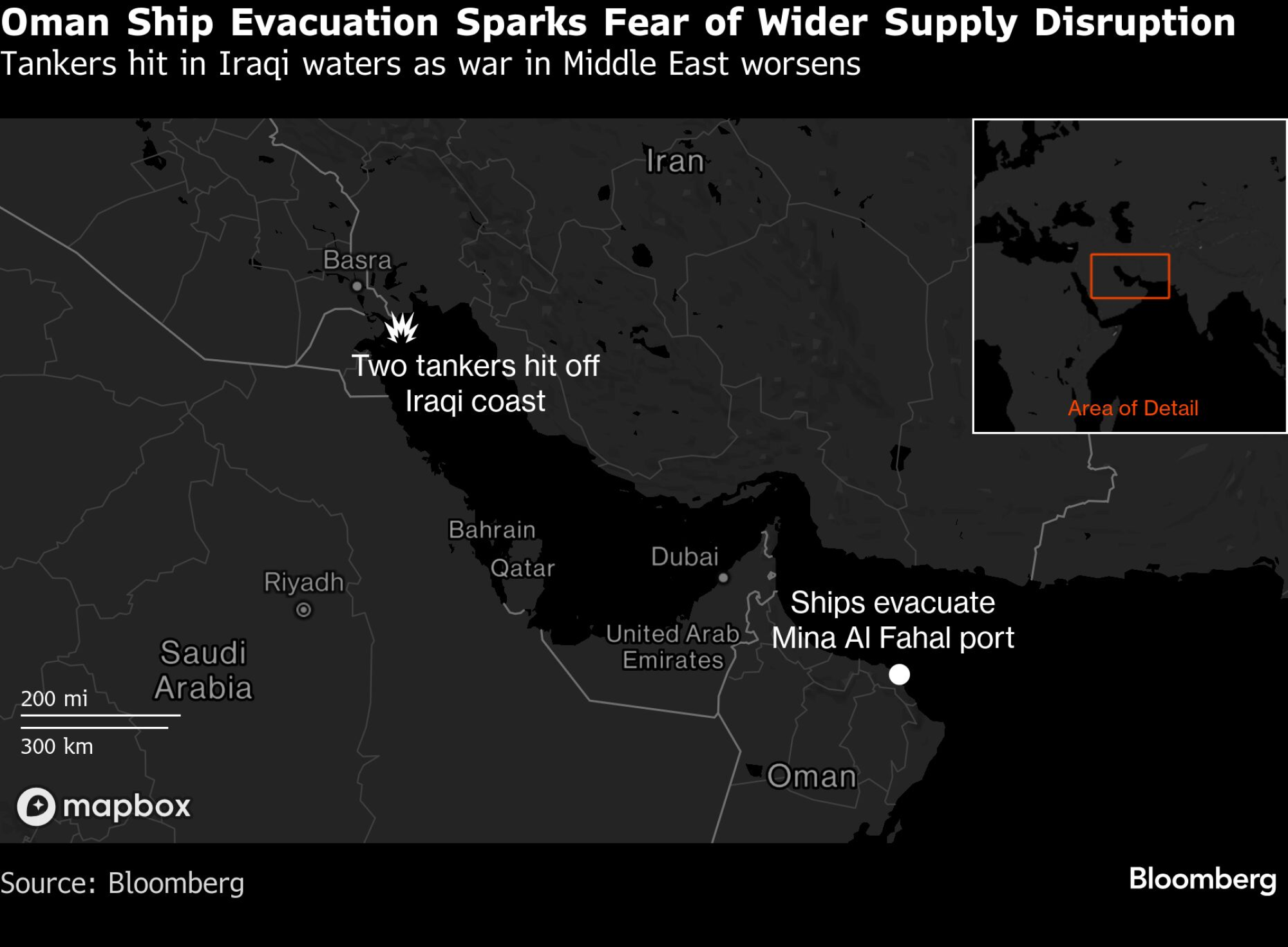 Oman je iz predostrožnosti evakuisao sve brodove iz luke Mina Al Fahal, rekli su izvori upoznati sa situacijom, što je jedna od retkih preostalih luka kroz koje nafta sa Bliskog istoka može da se transportuje na globalna tržišta. Irak je, takođe, obustavio operacije na svojim naftnim terminalima nakon što su brodovi bili meta napada, rekao je za državne medije direktor General Company for Ports Iraq.