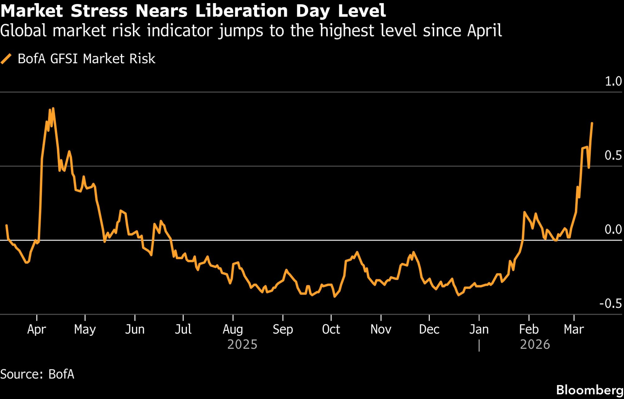 Indeks tržišnog stresa Bank of America koji meri očekivane promene cena na tržištima opcija za akcije, kamatne stope, valute i robu porastao je na 0,79, što je blizu najviše vrednosti od 0,89 koja je zabeležena tokom turbulencija u aprilu prošle godine, kada su carine koje je uveo predsednika SAD Donalda Trump izazvale snažan pad na tržištima. Vrednost iznad nule signalizira veći nivo napetosti od uobičajenog.